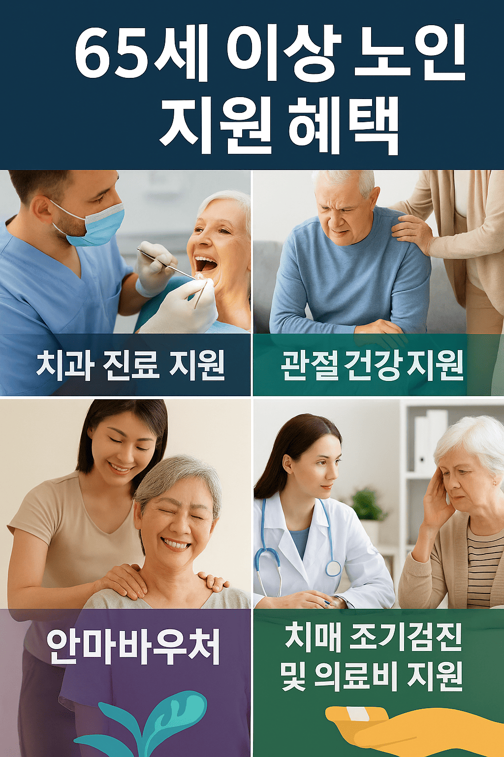 65세 이상 고령자에게 있어 의료비 부담은 생활비 중 가장 큰 비중을 차지합니다. 특히 은퇴 이후 고정수입이 줄어든 상황에서 치과 진료, 정형외과 치료, 만성질환 관리 등은 생활을 더욱 어렵게 만드는 요인으로 꼽힙니다.이러한 문제를 완화하기 위해 정부와 지자체는 65세 이상 의료비 지원제도를 마련해 다양한 혜택을 제공합니다.2025년 현재, 이 제도를 제대로 활용하지 못하면 연간 수십만 원에서 수백만 원까지 손해를 볼 수 있습니다.이 글에서는 임플란트, 틀니, 무릎 인공관절, 안마바우처, 치매 검진 등 65세 이상이 받을 수 있는 주요 의료비 지원 제도와 신청 방법, 주의사항을 총정리합니다. 1. 치과 진료 지원 – 임플란트·틀니 비용 절감 임플란트 지원65세 이상 건강보험 가입자는 평생 2개까지 임플란..